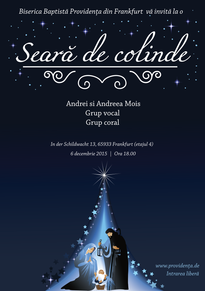 În data 25 Decembrie 2015, de la ora 17:00, vom sărbători împreună Întruparea Domnului Isus Christos: corul bisericii va colinda, ne vom ruga și vom asculta o predică despre acest eveniment.