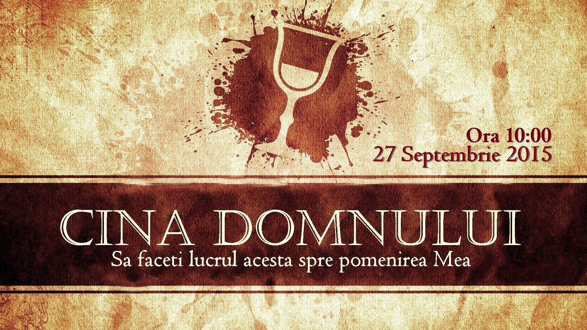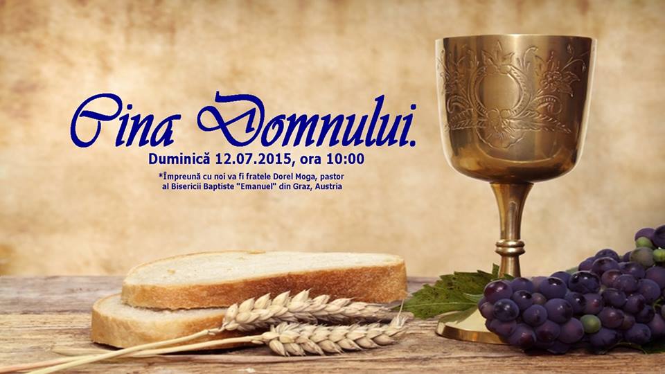 Pe data de 27 Septembrie 2015, în cadrul serviciului de dimineață, vom sărbători Cina Domnului. Împreună cu noi va fi Fratele Viorel Candreanu, pastor al Bisericii Baptiste din Ipotești, Suceava.