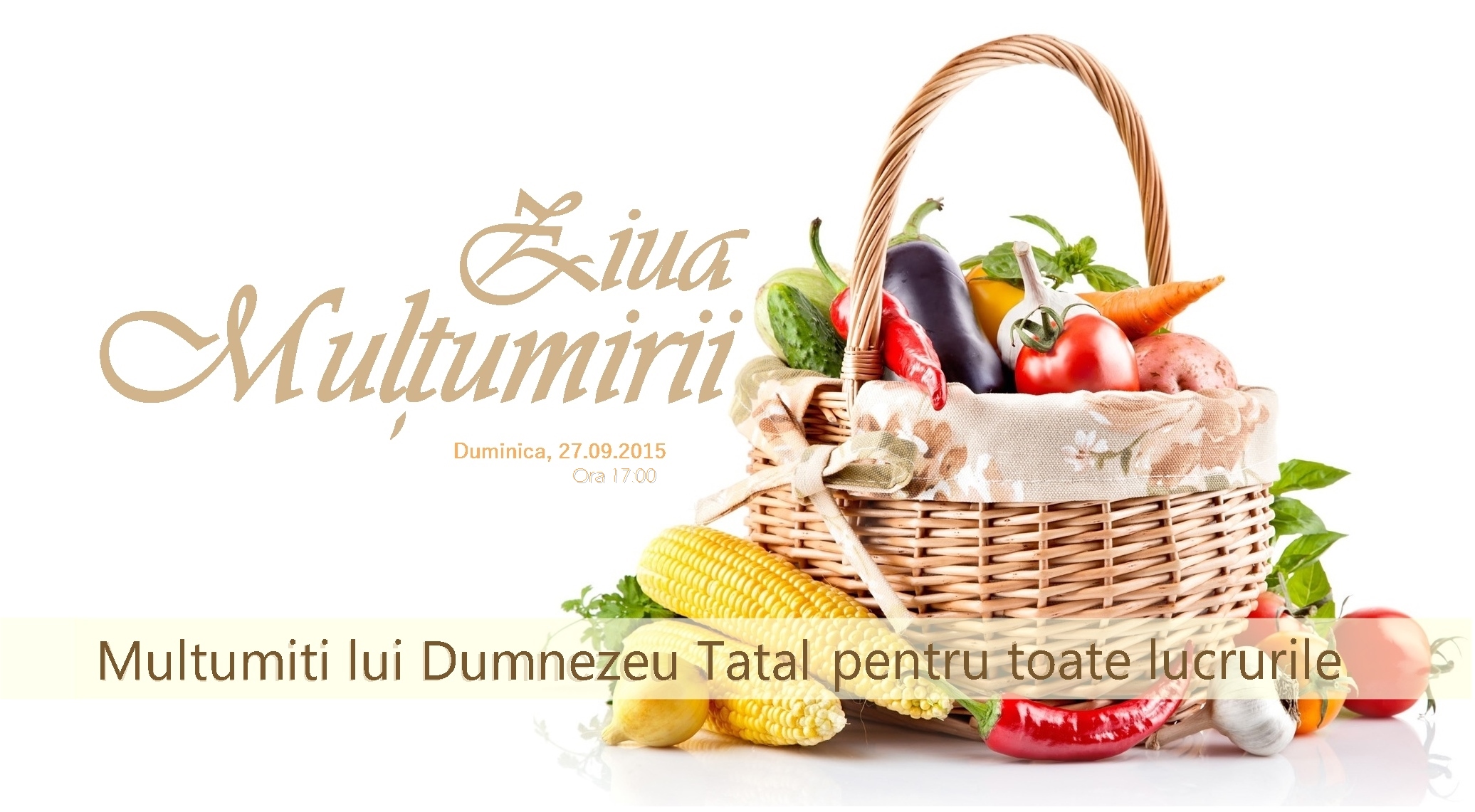 Pe data de 27 Septembrie 2015, în cadrul serviciului de după-amiază, pe care-l vom începe cu această ocazie de la ora 17:00, vom sărbători Ziua Mulțumirii. Împreună cu noi va fi Fratele Viorel Candreanu, pastor al Bisericii Baptiste din Ipotești, Suceava.